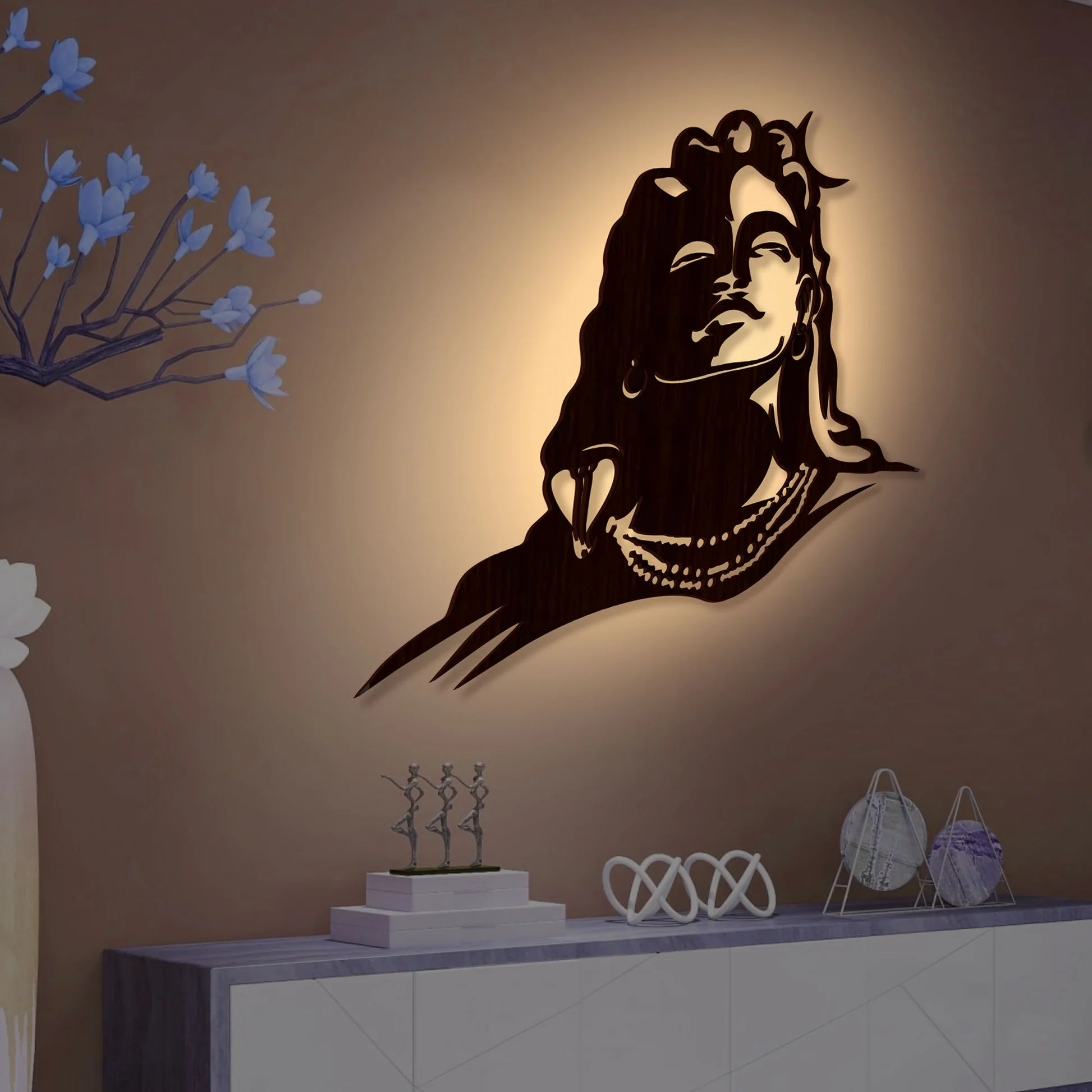The Elegant Backlit Adiyogi Lord Shiva Wooden Wall Hanging with Night Light is a stunning piece of art that beautifully blends spirituality and modern design. Crafted from high-quality wood with a rich walnut finish, this wall hanging showcases a detailed depiction of Lord Shiva, making it a perfect centerpiece for any room.
