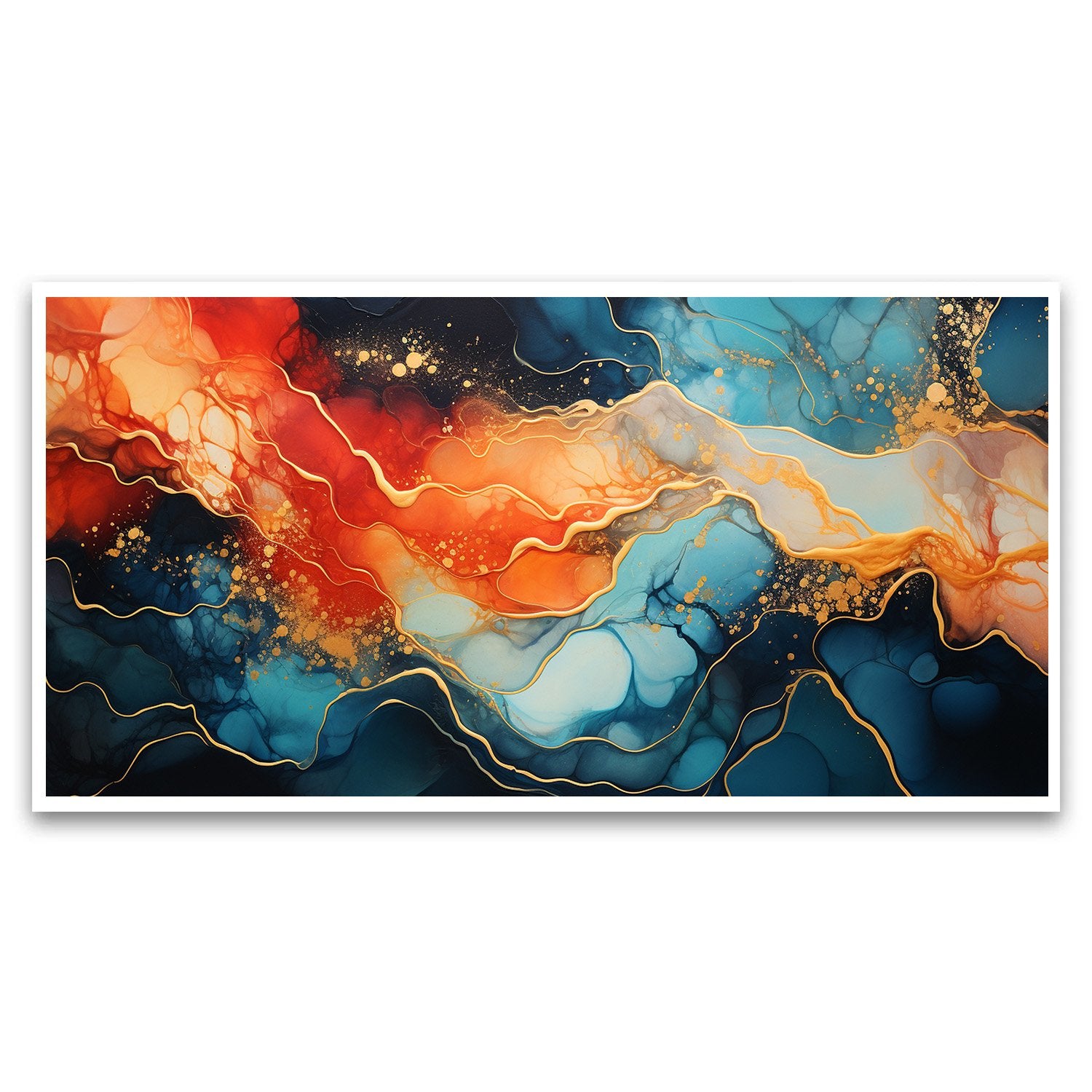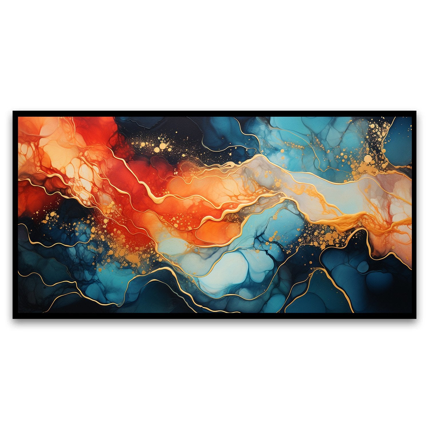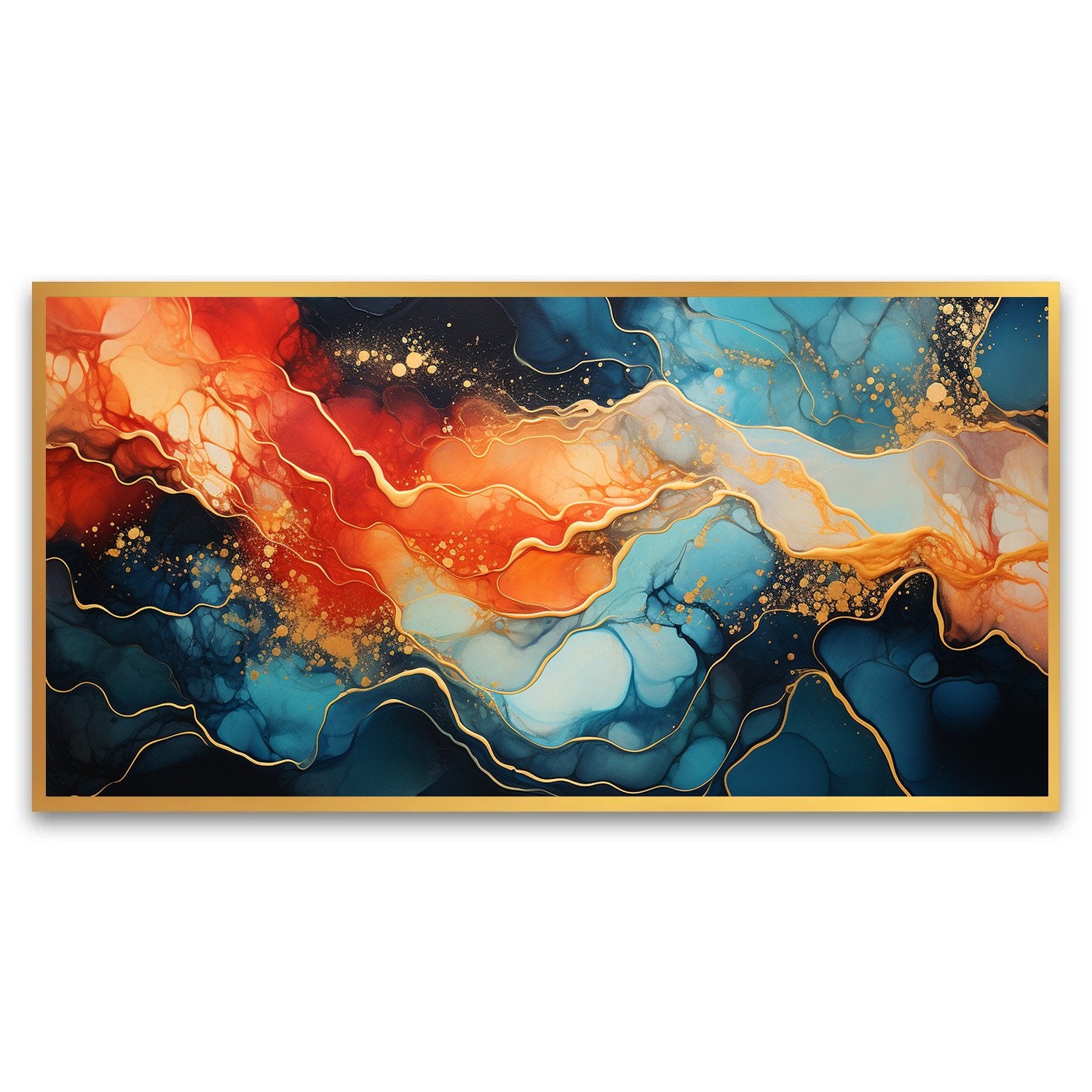 Transform your space with this captivating abstract painting that features a vibrant swirl of blue and orange, beautifully accentuated with luxurious gold highlights. The dynamic interplay of colors creates an energetic yet harmonious visual experience, making it a perfect centerpiece for any room.
