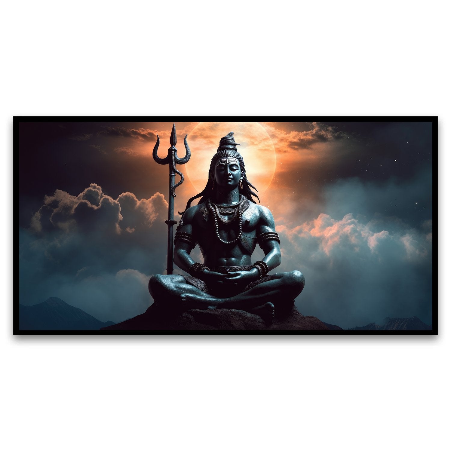 This stunning piece beautifully depicts Lord Shiva, the embodiment of peace and wisdom, illuminated by the gentle glow of the moon. The intricate details and rich colors capture the divine essence of this celestial moment, inviting tranquility and spirituality into any room. The moonlight enhances Shiva's serene expression, creating a harmonious balance between spirituality and nature that resonates deeply with viewers.