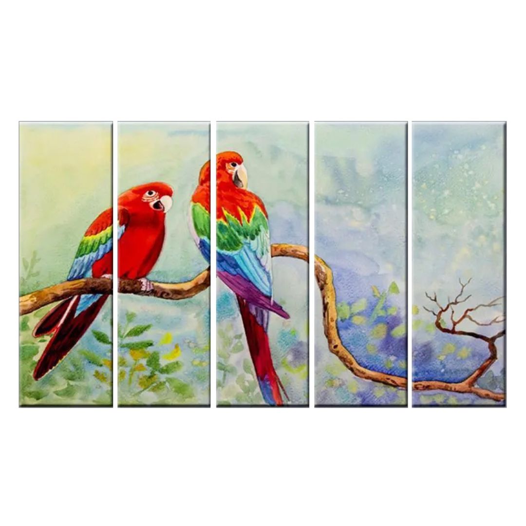 Elevate your home and office decor with our Exquisite Parrot Love Couple 5 Piece Multi Frame Canvas Print Wall Painting. This stunning artwork features a vibrant and romantic portrayal of two parrots in love, captured in a beautifully coordinated five-piece layout. Bring warmth and charm to your environment with this exquisite piece that celebrates love and beauty in nature.
