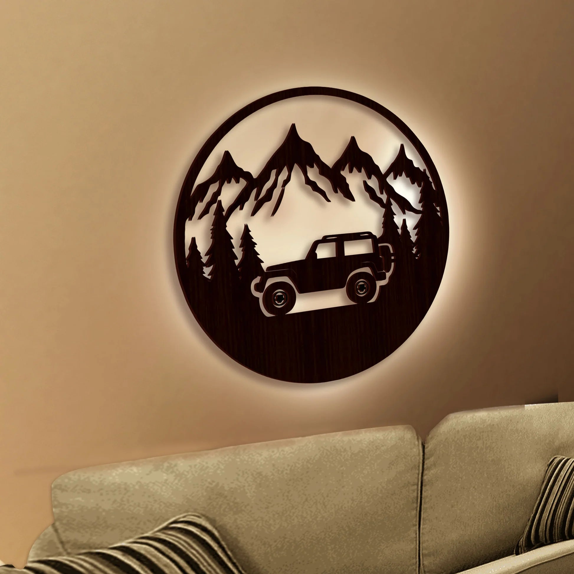 Bring the beauty of the great outdoors into your home with our Mountain Forest Road Jeep Art Backlit Wooden Wall Hanging, beautifully finished in walnut. This striking piece captures the adventurous spirit of off-road exploration, featuring a detailed jeep design set against a backdrop of majestic mountains and lush forests. The gentle LED backlight casts a warm glow, creating a cozy atmosphere perfect for any room.
