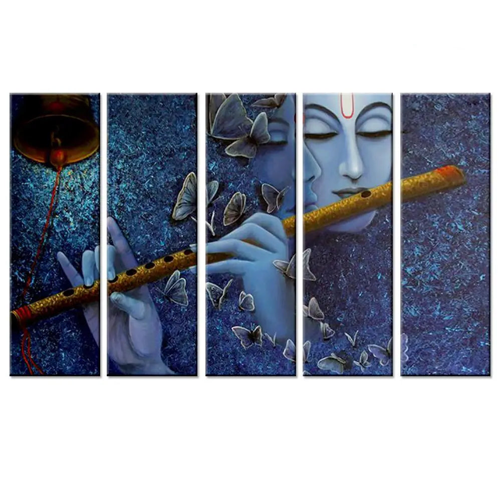 Krishna with Flute Beautiful Set of 5 Frame Canvas Painting for Living Room, Bedroom, Office Wall Decoration (24" x 8" Each Panel)