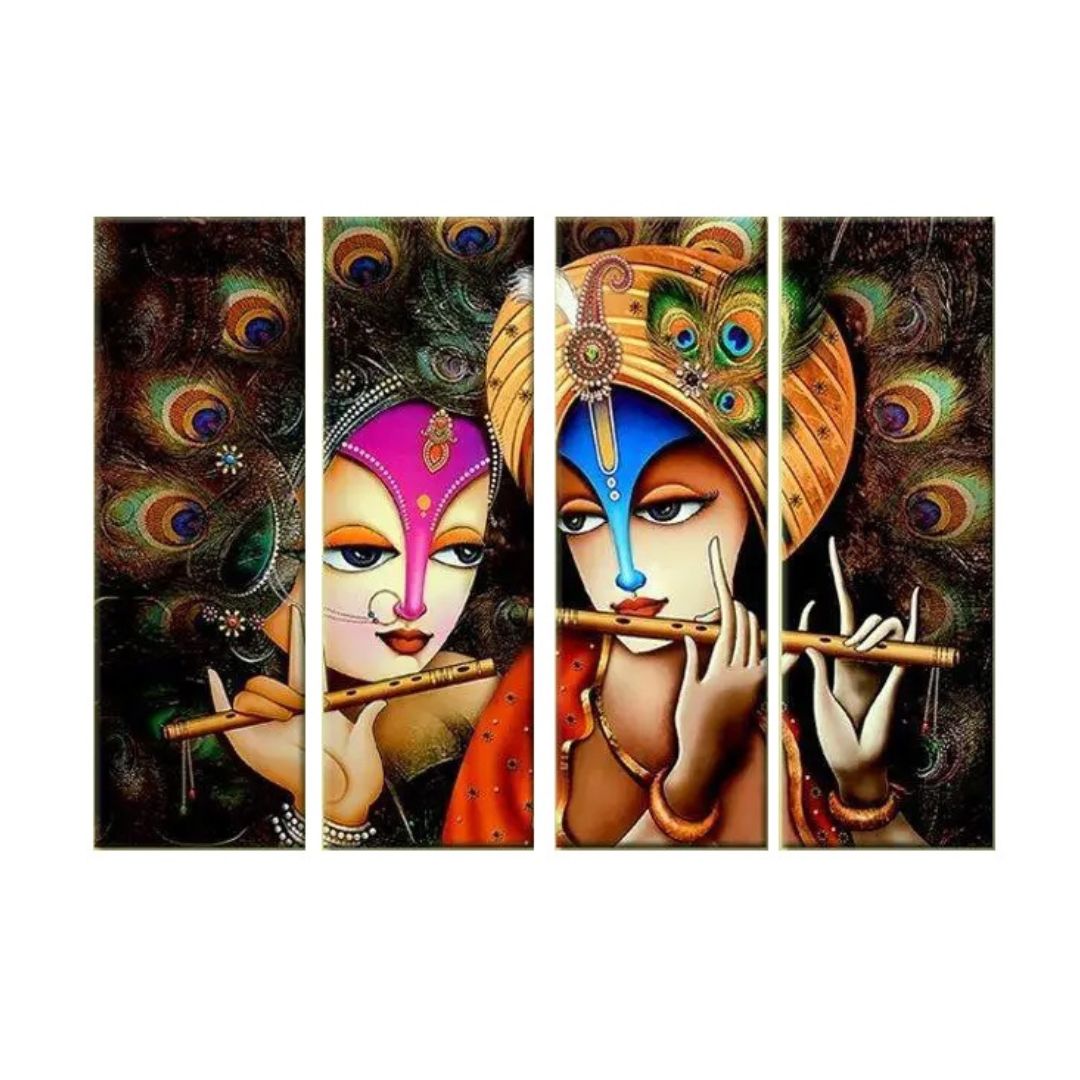 Madhubani style Multiple Attractive MDF Frames Split Art Texture  Radha Krishna Canvas Wall Painting  for Living Room, Bedroom, Office Wall Decoration (18" H x 8" W x 4 panels)