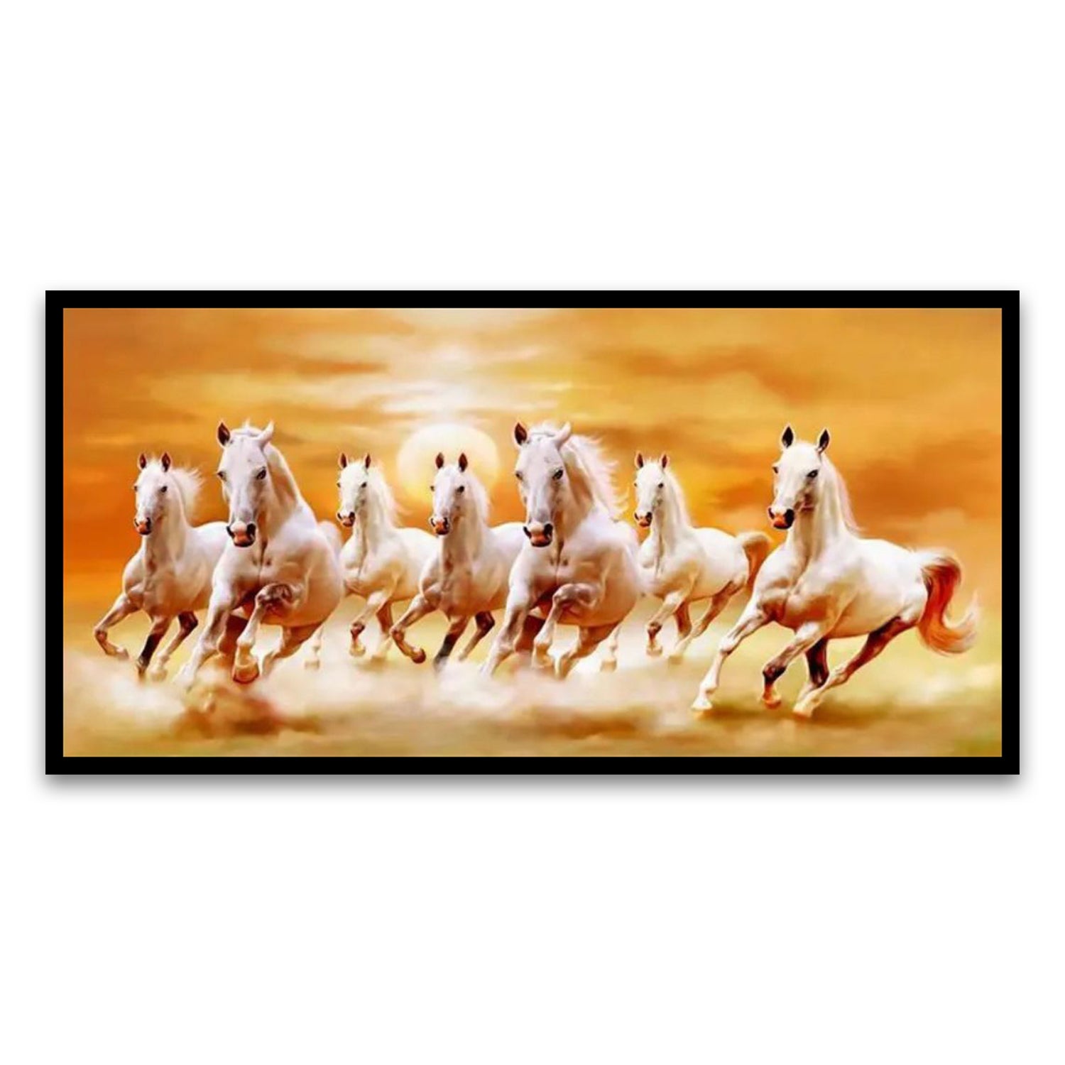 A stunning portrayal of grace, power, and elegance. This exquisite artwork captures the mesmerizing scene of seven running horses in full motion, bringing a touch of sophistication to your home or office wall. Enhance the ambiance of your living space with this captivating canvas painting. The dynamic composition of seven galloping horses symbolizes strength, freedom, and unity, making it a perfect addition to your interior décor. Measuring 48 inches in length and 24 inches in height, this canvas painting is meticulously crafted with attention to detail. The high-quality canvas material ensures vibrant colors and long-lasting durability, allowing you to enjoy its beauty for years to come. Whether it's your living room, bedroom, hallway, or office, this canvas painting complements a variety of spaces and styles. Its unique blend of elegance and energy is sure to spark conversations and admiration among your guests. Are you looking for a thoughtful gift for a friend, family member, or colleague? This exquisite canvas painting is a perfect choice. It's a timeless piece that carries both aesthetic and symbolic value, making it a memorable present for special occasions.