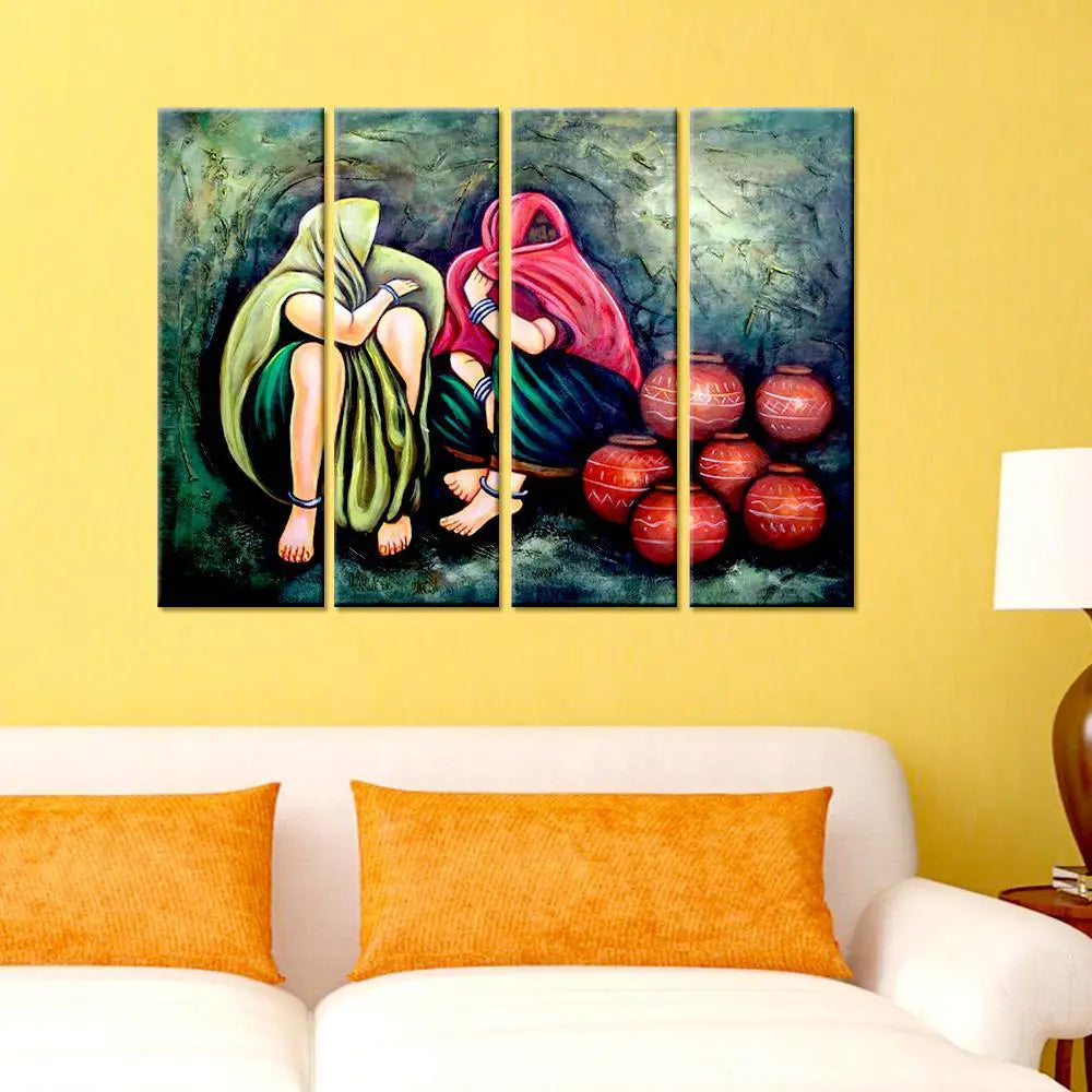 Rajasthani Folk Art Village women Multi Framed Canvas Printed Wall Painting for Living Room, Bedroom, Office Wall Decoration(24" H x 8" W Each panel)