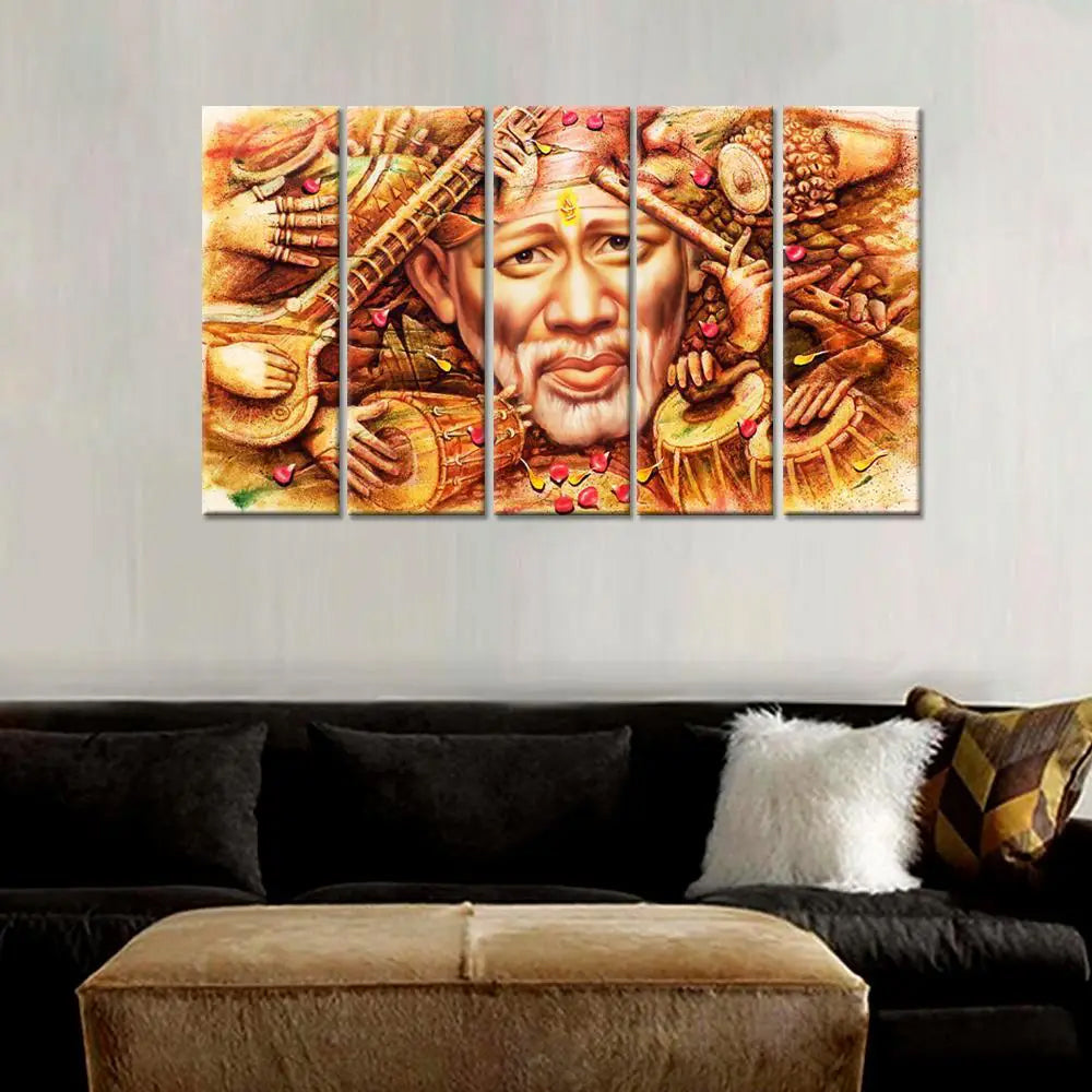 Sai Baba Indian Religious 5 Pieces Canvas Print Wall Painting Framed Canvas Wall Painting for Living Room, Bedroom, Office Wall Decoration (24" x 8" Each Panel)