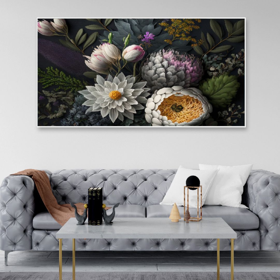 White Flowers on Dark Background Floating Frame Canvas Wall Painting